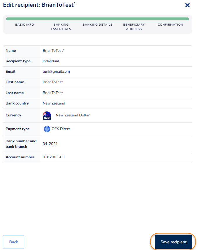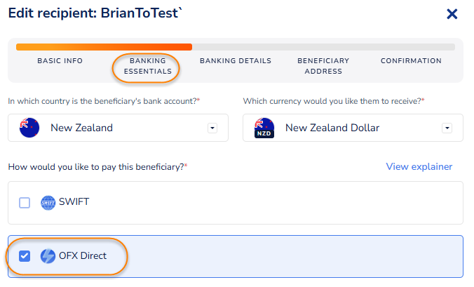 InformationDetailsTo update a recipient’s payment method from SWIFT to OFX Direct, follow these steps: 1. Log into your OFX account. 2. Navigate to the Recipients section from the sidebar menu. 3. Locate and select the recipient you wish to update. 4. Click on the Edit button to modify the recipient details . 5. In the 'Banking Essentials' section, select OFX Direct as the new payment method. 6. Ensure that all required fields are filled out correctly, including banking details specific to OFX Direct. 7. Review the changes and click Save recipient to apply the updates. Why is this page important? Updating the payment method ensures that transactions are processed efficiently when using OFX Direct compared to traditional SWIFT payments. This can enhance transaction speed associated with international transfers. Next Steps: After saving the changes, verify that the updated recipient information is correct.Monitor future transactions to ensure they are being processed via OFX Direct.TitleHow do I update the recipient from SWIFT to OFX direct?URL Namehow-do-i-update-the-recipient-from-swift-to-ofx-direct