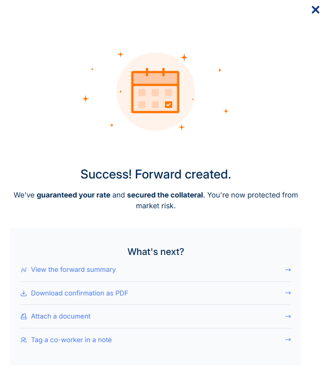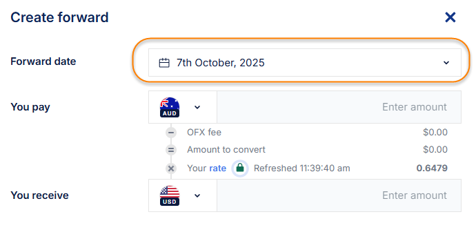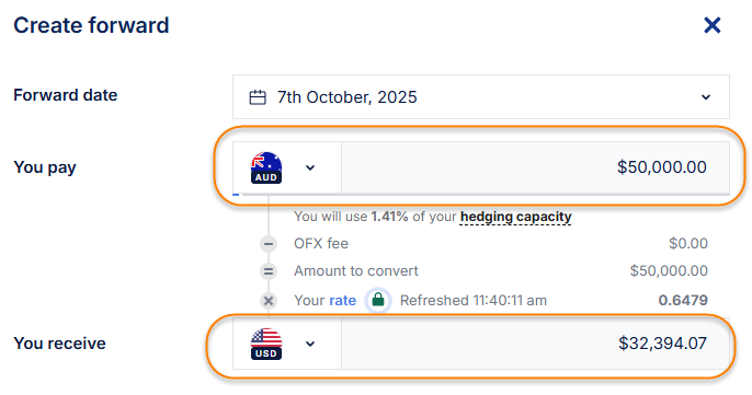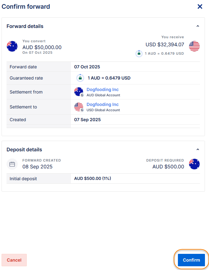 InformationDetailsDetails: To book a Forward Conversion, do the following steps:1. Log in to your OFX account.2. Navigate to the "Forwards" section. 3. Click on "+Create forward". 4. Choose the "Forward date" (or maturity date) for the forward contract, which can be up to 12 months (or longer depending on product terms).5. Select the currency pair and enter the amount you wish to convert. 6.The system will calculate the initial deposit required based on current margin requirements; this deposit must be paid within three business days to secure the contract. 7. Click on "Continue". 8. Review the booking details. Click on "Confirm" to complete the booking request. 9. A confirmation page is displayed, confirming that the booking was successful:Why is this page important? Booking a forward contract helps protect your business from adverse currency fluctuations by locking in rates ahead of time, providing certainty over costs and cash flow planning. Next Steps: Monitor your forward contracts regularly and top up deposits if margin calls occur. Contact your dealer or support team for assistance with complex scenarios. Related FAQ Articles: How do I pay the deposit for a Forward? TitleHow do I book a Forward Conversion?URL Namekb-3143958754-how-do-i-book-a-forward-conversion
