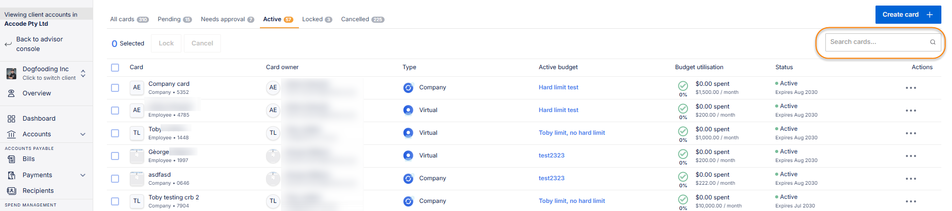 How can a user search cards?